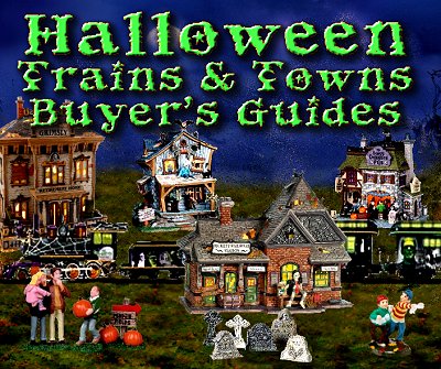 When we started this page around 2006, there were only enough Halloween trains and towns available online to fill one page (a few of those are shown below). For 2012, we broke these out into separate Buyers' Guide pages by category. Unfortunately, the recent recession caused many manufacturers to cut way back on new factory orders. Products that were in stock in 2009 have sold out, and there isn't anything to take their place yet, so stocks are VERY thin. Update, August, 2013 - In the next few days, I plan to comb the internet looking for products that will help you have Halloween Village display you need. In the meantime, most of the products we have currently listed have sold out, so please forgive us if you click on a link and nothing happens. Just remember to check back soon. That said, we still feel good about our recent expansions to this site, because we are confident that the pendulum will swing back eventually, even if it takes a while. And in the meantime, if you're still stretching your dollars, you can download our free Spook Hill graphics, plans, and instructions and make your own Halloween Village for pennies. The buyer's guide categories we have so far are: