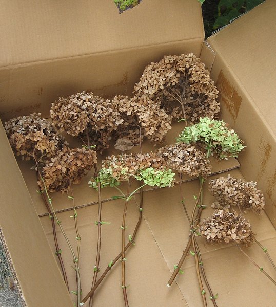 The cost of the whole leaf project was less than $2 ( or under $3 if I get the other stamp.) Of course, if you don't have a Target or other source of inexpensive leaf-shaped punches, you may wind up getting yours at a stampbooking place for $9. In that case, you have to reexamine whether the project is worth it to you. By the end of Thanksgiving, the leaves were too dusty to reuse, so I pulled them up and put the paper punch and paper away until next year. (If you had a lot, and your "base" is pretty sound, you could do this in a hurry with a lint roller.) On the other hand, if you wanted to have a permanent base for an autumn diorama or such, there's no reason you couldn't glue them down and seal them with a clear satin or "flat" acrylic spray. As always, your mileage will vary. Please let us know if you think of another use for these things, or if you have a photo you'd like to share. Colorful Trees This is a tip that we remembered when it was time to trim our Hydrangea arborescens bushes (what Grandma called "Snowballs."). Hydrangea flower heads aren't real sturdy, so this is something that will last a few weeks, but it's easy enough to do it again next year. If you or someone close to you has Hydrangea bushes, or another flower head that dries out in October, cut a few heads off, bringing up to 18" of stem with each if you can.