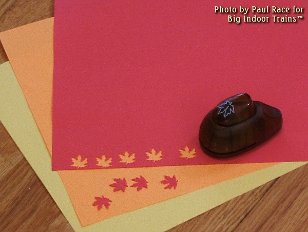 In the summer of 2007, I spent some time shopping for autumn-colored leaf-shaped confetti a person could dump on a village or railroad. But the only stuff I could find was sparkly or shiny, which I didn't want. Then, in early fall, Shelia brought a leaf-shaped hole-punch home from Target that she had bought for a dollar. The leaves are not much more than 1/4" across, which makes them a little oversized for most holiday village people, and even bigger compared to most holiday village houses. Still, they're still small enough and have enough detail to look okay in a pile. These punches are made to survive light use with light card stock. Shelia tells me that you are supposed to punch holes in the paper so the background shows through, and the little leaf-shaped punchouts are just a "by-product." But I'm interested in the leaf-shaped punchouts. I plan to sprinkle them around my holiday village to give an autumn feelings. In some cases, I may even be able to camouflage the white globs on the roof of my "winter" buildings. You don't need card stock to represent leaves on your holiday village, and you don't need to buy three packs of colored construction paper, either. I went to Staples and bought some red, orange, and yellow copy paper from their quick-printing center, for about .08 each. Besides being cheap, this 20-24lb stock is easier to punch than the 40 or 60lb stock that the punch is made to use, which means: