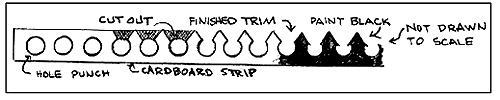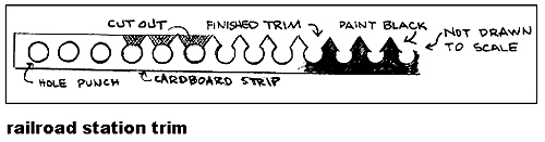 - From a strip of rigid cardboard, create the roof trim. You start this process by punching a series of holes in the cardboard strip as shown below. We have no scale drawings for this part of the project because the size of the cardboard strip you use and the distance between the holes depends on the size of your hole punch. When you are through, cut diagonal lines in the cardboard as shown to create a gingerbread pattern. By the way, this "trim" served real functions on old train stations - it discouraged pigeons, and it usually served as an extension of the lightning rod system.