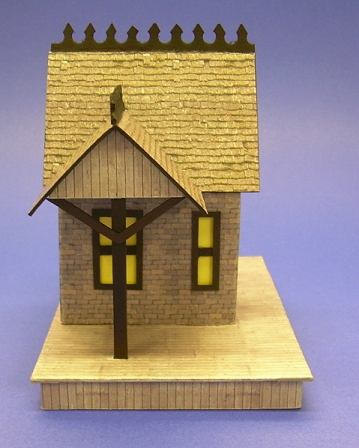 The photo to the lower left shows the underside of the roof overhang section. The T-111 siding pattern has been applied to the "ceiling" to give it a "porch ceiling" effect. This piece has also been notched to accept the support post that is shown in the detail below. The photo to the lower right shows the major station components, each glued together, with windowframes painted, and graphics paper applied.