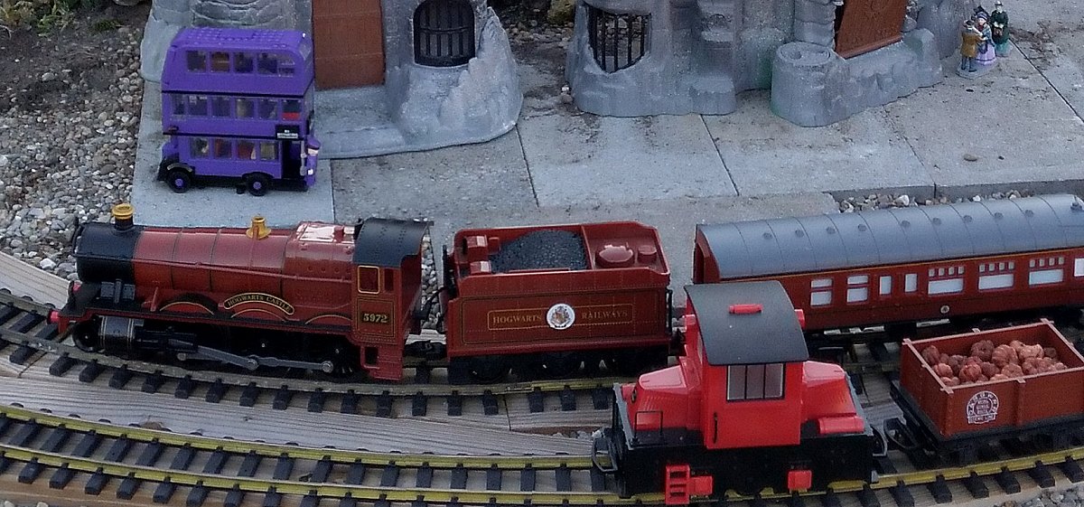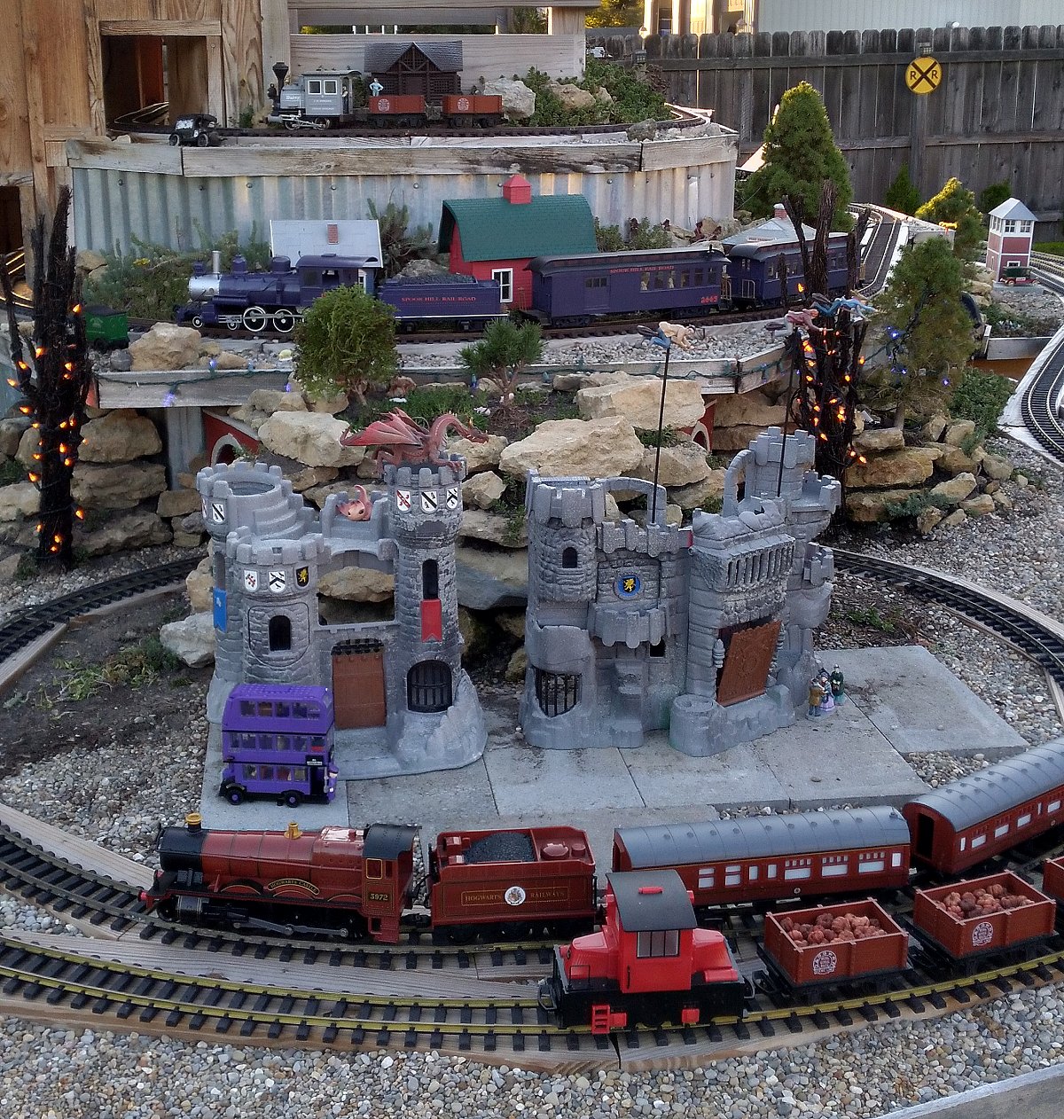 The castles are Fisher Price toys that I painted and weathered. The coats of arms are the family arms that our family's ancestors would have had, had they been nobles. The Knight Bus is a Lego product (but you knew that) The Hogwarts Express is a battery-powered G gauge Lionel toy train. Lionel currently makes the same train, but it runs on 2" track. It's not compatible with my railroad's track, but it is fun to put on a side porch, etc. In the foreground is an HLW gas-electric pulling a string of HLW mini-gondolas filled with "putka pods," which look like tiny pumpkins. If you look very carefully above the castle to the right, you'll see Harry, Hermione, and Ron flying on broomsticks over the castle, presumably avoiding the dragon on the other castle. These are cake decorations that haven't been made in some time, I'm afraid. Plans?I'm thinking about maybe setting this display up away from my permanent railroad this year. We'll see. When I ordered the Lego Knight Bus, I imagined putting a "power truck" underneath it so it could run on my train tracks. That's still possible, but it would take disassembling the bottom and rebuilding it completely. And none of the power trucks I had are quite the right size. Again, we'll see. Please have a wonderful holiday season this year, and please enjoy any time you have with your family in the coming days! For more information, please contact us. |