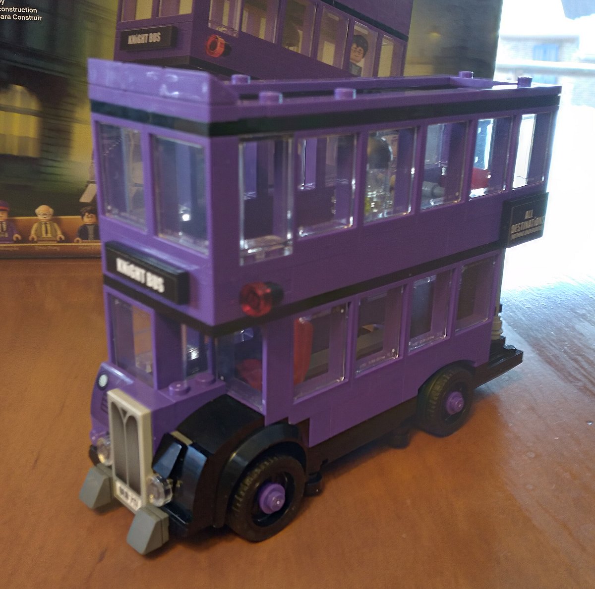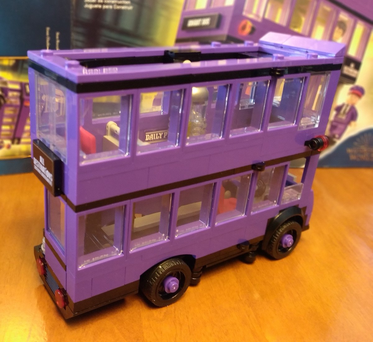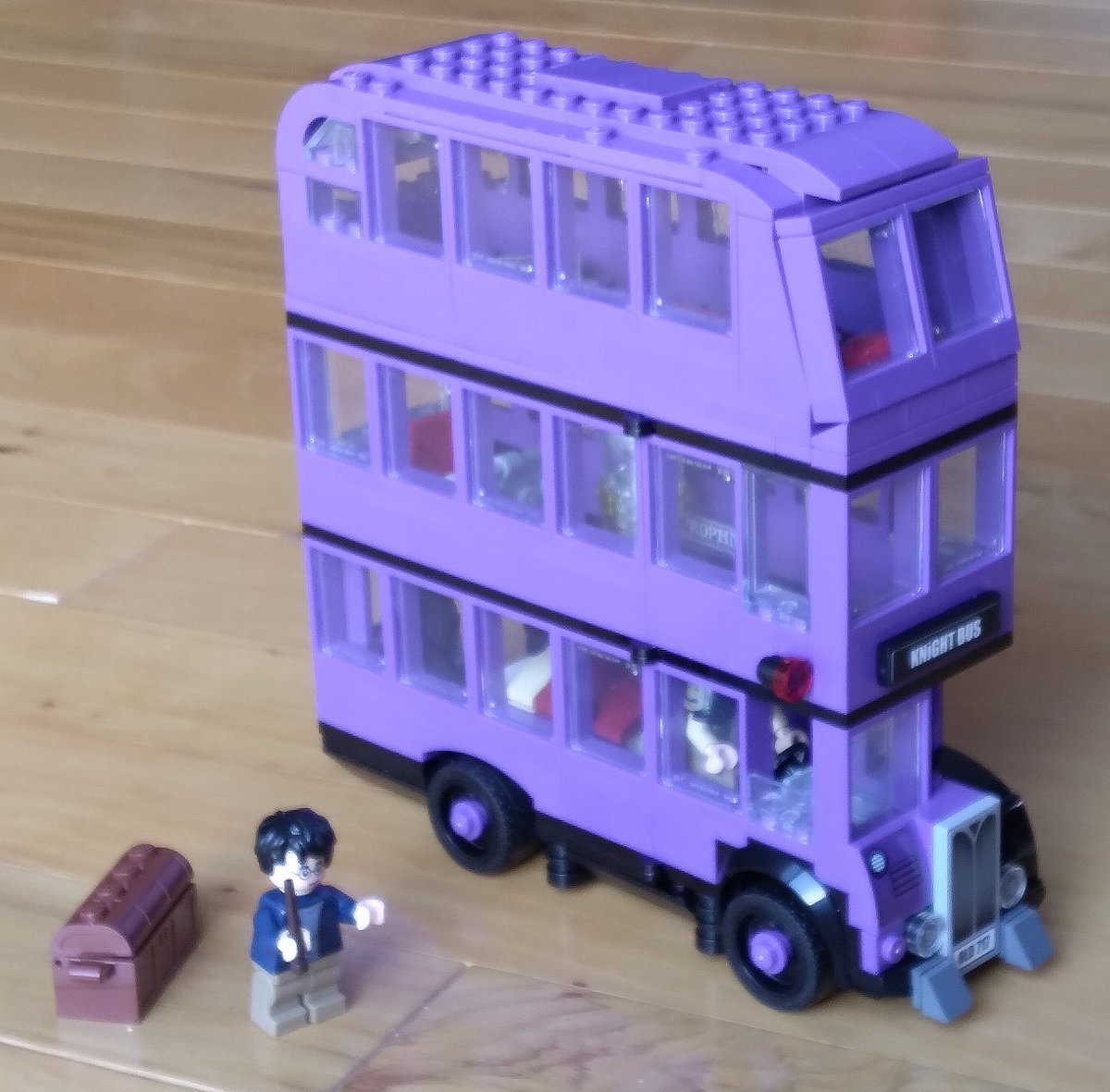 There are countless die-cast double-decker toys, but most of them are far too small to go with my trains. One model that was promising was Revell Germany's model of a similar double-decker (above right). Painting the shells purple and kitbashing two of them together wouldn't be that difficult for me. That said, coming up with the cash to buy two of them would have been, er, interesting. They're currently selling for around $100@ at Amazon. Other sites sell it cheaper, but charge shipping, so it comes out about the same. I finally settled on the Lego(r) Kit, currently available from Amazon for about $60. I think I got it cheaper by shopping around, but it doesn't seem to be in production any more so they are getting harder to find, and the price is going up. The Lego set is a little too small for my trains, and it may be a little too large for, say a Lionel railroad or holiday village. But we are talking fantasy, right? The bus comes with a little Harry Potter, his case, the driver, a bed or two, the shrunken head, and the conductor, who is a character in at least two of the books, named Stan Shunpike. That said this conductor seems a bit generic. Poor Stan never gets a break. AssemblyHere's the truth. This set was not made for people with weak eyes. Many of the parts are tiny.![]() The instructions are only pictures. They aren't bad, although sometimes you have to turn the pieces over a few times to see exactly which pieces you're supposed to use where. Having pieces in separate bags you open one at a time (mostly) is good, too. As you approach the end of the project, you'll learn that a few of the little pieces that sit on the bottom don't attach all that well, so picking the thing up, or even bumping it will cause them to fall off. If I was going to use this as a permanent feature of my railroad, I believe I would start by gluing some of those pieces together. Yes, I realize that's Lego heresy!