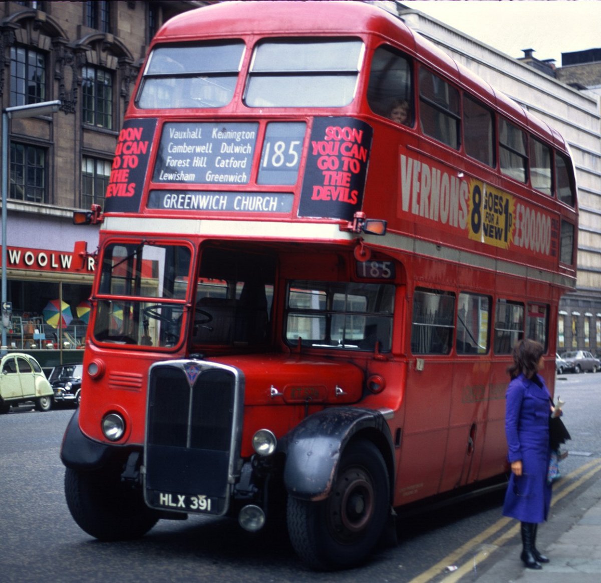 A Knight Bus(r) for Train and Town HobbyistsWhatever you think of J.K. Rowling, you have to admit that she is clever and creative. The early books, especially, are constantly introducing new and clever aspects of the "Wizarding World(r)" that no one ever thought of before. One of them is a sort of magical emergency rescue vehicle that transports stranded wizards to safe places. In The Prisoner of Azkaban , it takes Harry Potter from a bench in the Dursleys' neighborhood through the streets of London to the Leaky Cauldron. When setting up models to represent aspects of the Wizarding World on my garden railway, I thought it would be fun to have a Knight Bus, maybe even one that would run on my track. Prototypes and ModelsI looked at many options, including realistic models of the double-decker bus that the Knight Bus was modeled on. According to the https://harrypotter.fandom.com/ site, This was a AEC Regent III RT. These were designed before WWII, and operated, with modifications throughout the 1950s (you can't have anything too modern in the Wizarding World, after all). The photo below was taken in 1972. Jimmy Baikovicius from Montevideo, Uruguay uploaded it to Wikipedia around 2012. According to Baikovicius, the woman in the blue coat is his mother. If you're wondering about the timeframe, note the Woolworth store in the background. To see fine details, click on the photo.